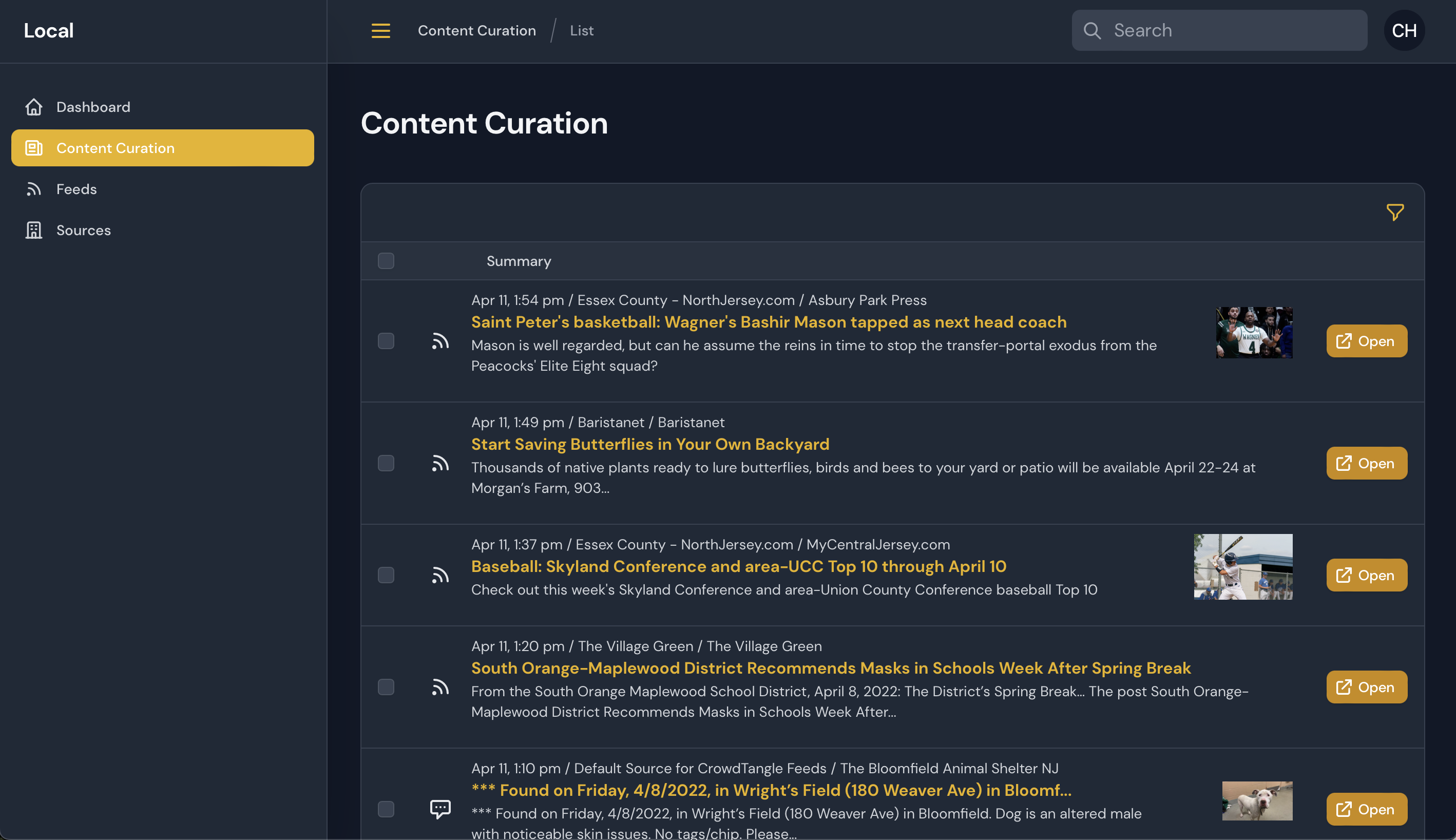 I made an assumption in the process of developing the mockups that it could work well to see a content item’s original headline in an administrative “curation” view and then, for purposes of rewriting the headline for the project’s Daily Bulletin, either open a new window to view the article/content in its original content, or just go straight to editing the headline in a pop-up modal within the tool.