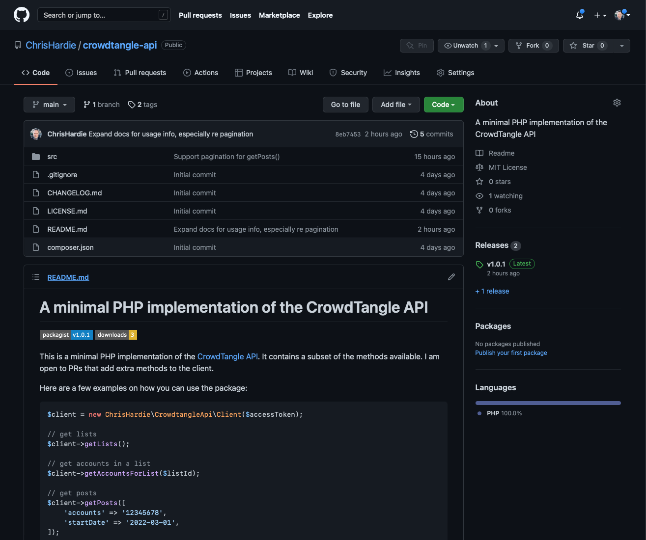 So now, anyone building an application in PHP that needs to integrate with CrowdTangle will have a head start that hopefully helps them get up and running much faster.