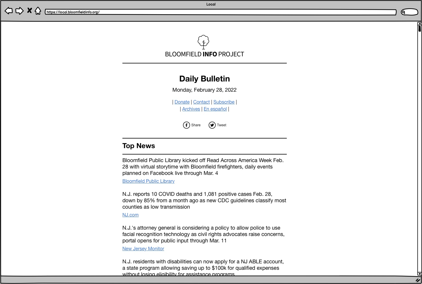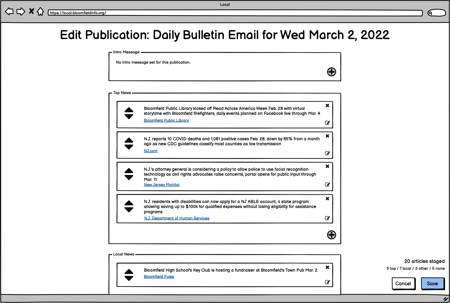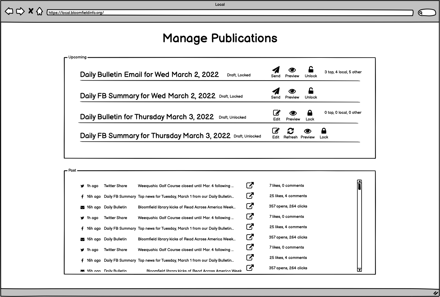 Once a publication was edited and finalized, it could be locked and scheduled for sending. The result would be the same kind of Daily Bulletin email that is currently produced, but all previewed and managed directly within the tool: